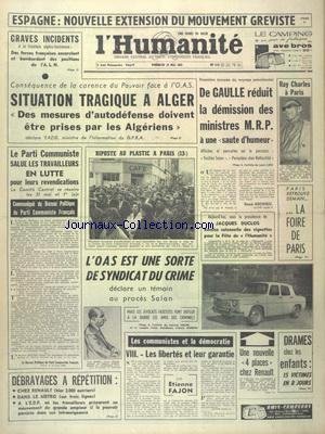 ESPAGNE - NOUVELLE EXTENSION DU MOUVEMENT GREVISTE - SITUATION TRAGIQUE A ALGER - CONSEQUENCE DE LA CARENCE DU POUVOIR FACE A L'OAS - LE PC SALLUE LES RTAVAILLEURS EN LUTTE POUR LEURS REVENDICATIONS - L'OAS EST UNE SORTE DE SYNDICAT DU CRIME DECLARE UN TEMOIN AU PROCES SALAN - DE GAULLE REDUIT LA DEMISSION DES MINISTRES MRP A UNE SAUTE D'HUMEUR - RAY CHARLES A PARIS - LES LIBERTES ET LEUR GARANTIES PAR FAJON